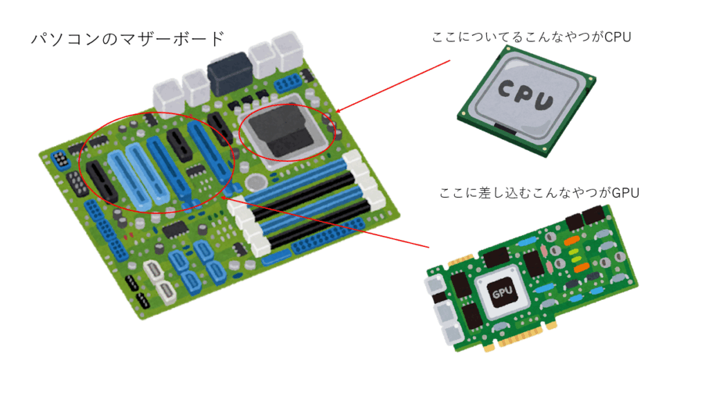 今のGPUはファンなどもついていて、イラストよりも大きく、ゴッツイです。