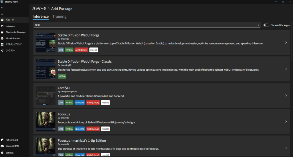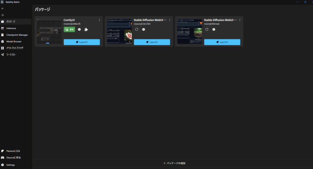 Stability Matrixを起動すると、このような画面になります。