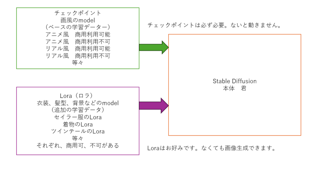 チェックポイントやLoraは使いまわしができるので、
