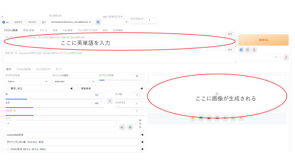 プロンプト(英単語の羅列)で画像を生成すると、