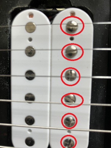 個別の弦の音が弱く感じたらピックアップのネジを回して弦に近づけるにゃ。
