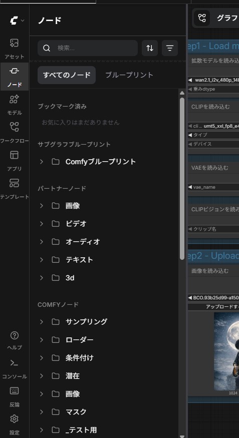 個別のノードはComfyUIの左側の、ノードから選んでセットできます。
