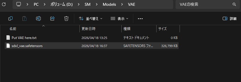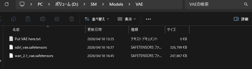 私のパソコンでは、Dドライブ、SM→Models→VAEに保存