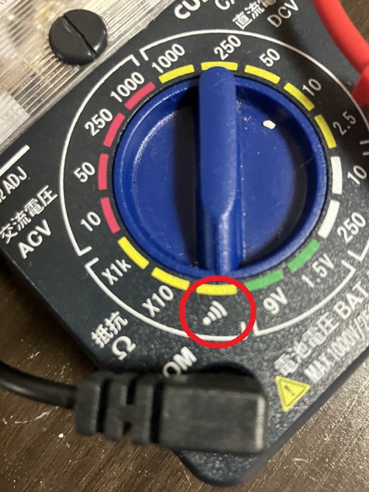 テスタを抵抗にして、通電したらブザーが鳴るところを選択します。